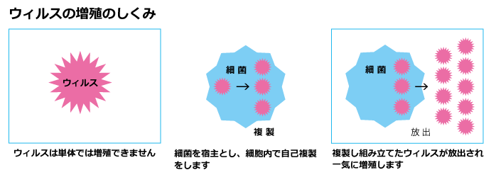 ウィルスの自己複製のゆりかごとなる菌を「宿主(しゅくしゅ)」と呼びます。宿主がなければウィルスは増えることができません。
